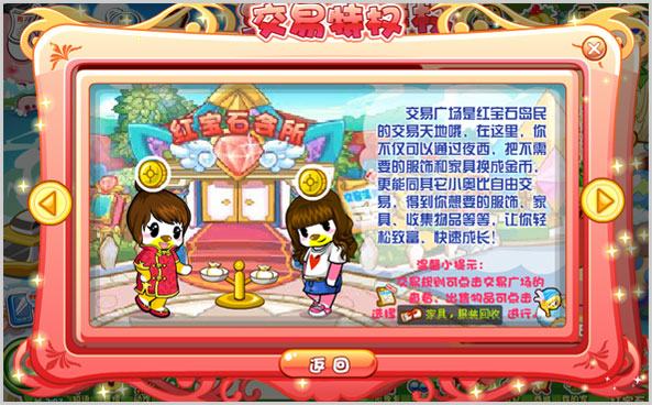 在交易广场,红宝石岛民除了可以把不需要的东西卖给夜西,还可以自由和其他红宝石岛民交易,得到你想要的物品。
