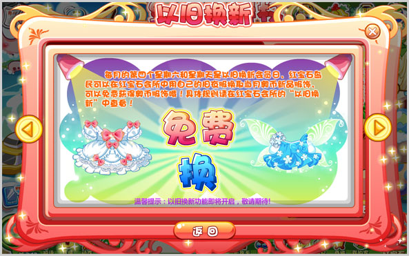 每月的第四个星期六和星期天和会员日举办“以旧换新”的活动日,红宝石岛民可以在红宝石会所中用自己的旧衣服换取当月奥币新品服饰,紧跟潮流脚步!