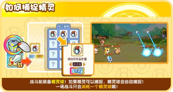 战斗前装备精灵球!如果精灵可以捕捉,精灵球会自动捕捉!一场战斗只会消耗一个精灵球哦!