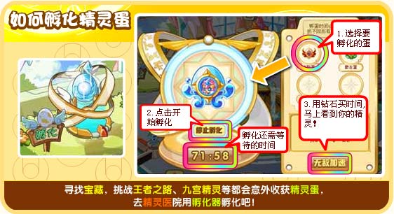 寻找宝藏,挑战王者之路、九宫精灵等都会意外收获精灵蛋,去精灵医院用孵化器孵化吧!