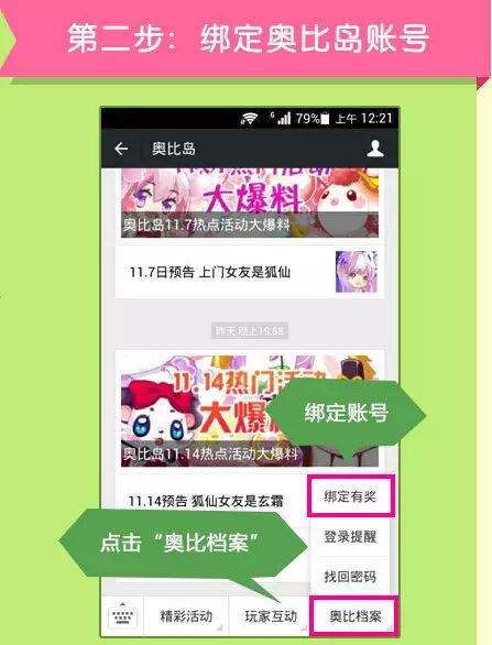 打开奥比岛微信对话框,点击底部菜单“奥比档案”,选择“绑定有奖”进行绑定。
